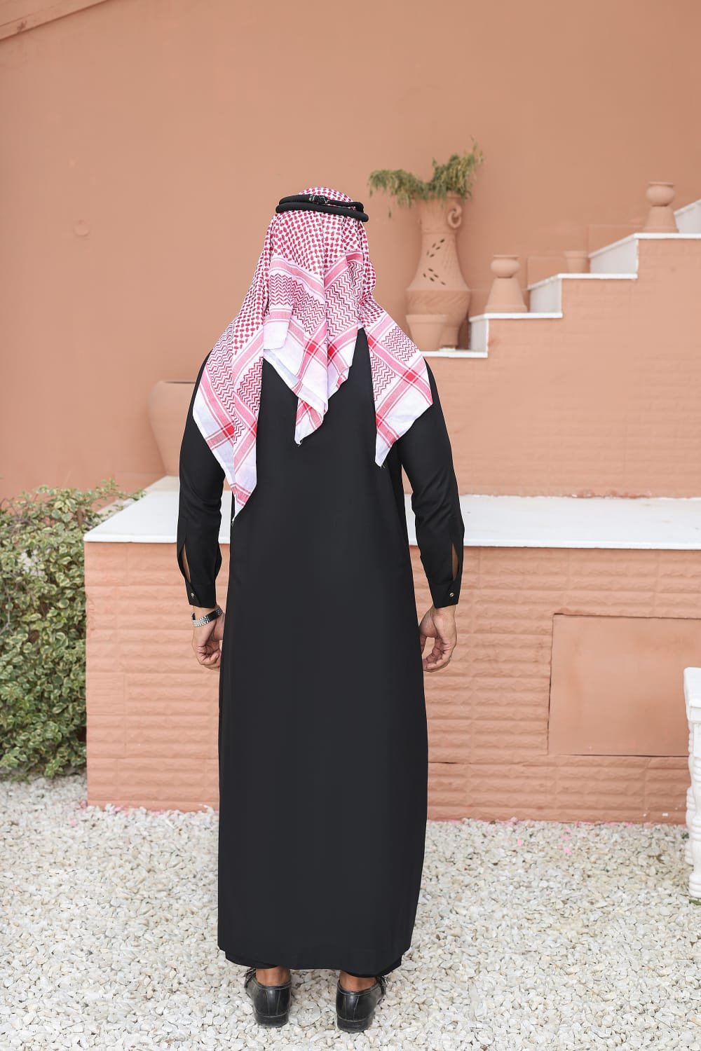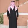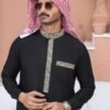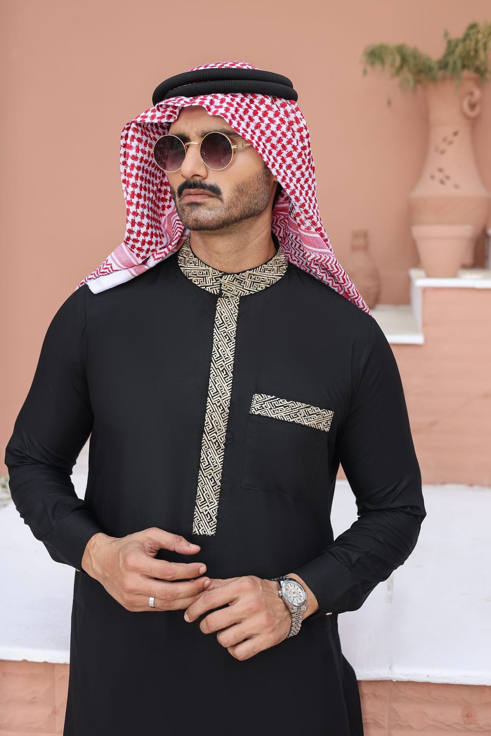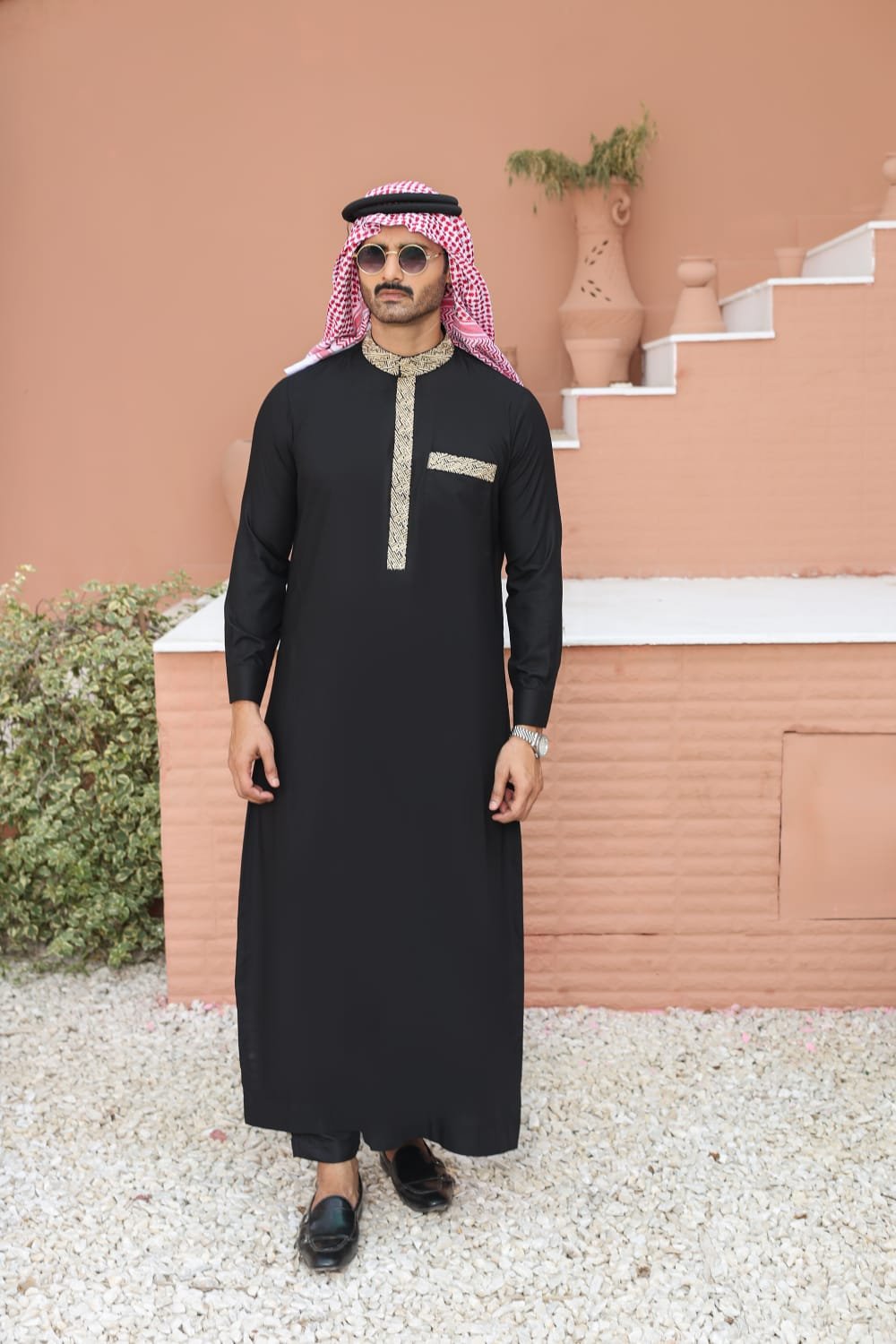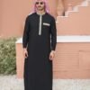 “A man wearing a white thobe with black embroidery on the collar and front placket,
